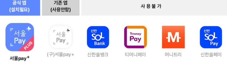 - 서울페이+ 앱을 공식 앱으로 사용됨에 따라 기존 앱들과의 연동 없이 서울페이+에서 모든 거래가 이루어지게 됩니다.