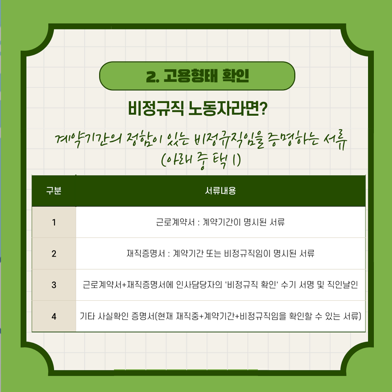 - 신청서류: 첨부파일 참고(주민등록 등본 또는 초본, 고용형태확인서류, 소득금액증명)