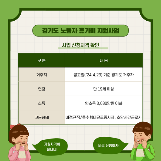 - 신청대상 : 경기도 거주자 만19세 이상 / 연소득 3,600만원 이하 / 비정규직, 특수형태근로종사자, 초단시간 노동자